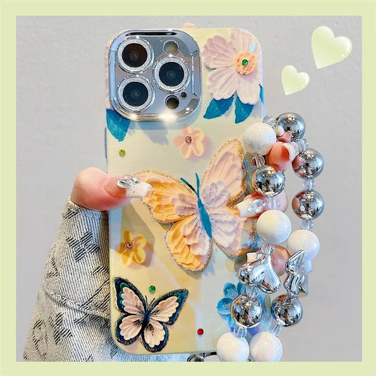Luxury Oil Painting Butterfly iPhone Case with Pearl Bracelet